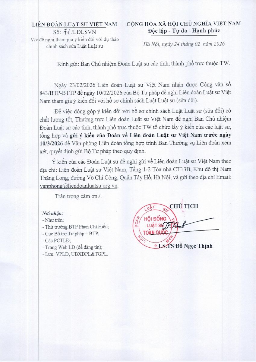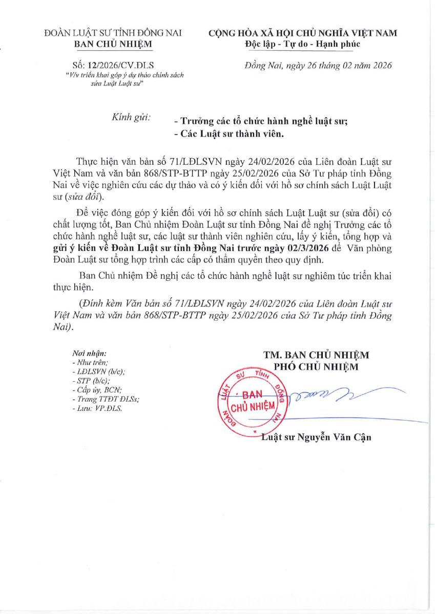 CV 12 VỀ VIỆC TRIỂN KHAI GÓP Ý DỰ THẢO CHÍNH SÁCH SỬA LUẬT LUẬT SƯ
