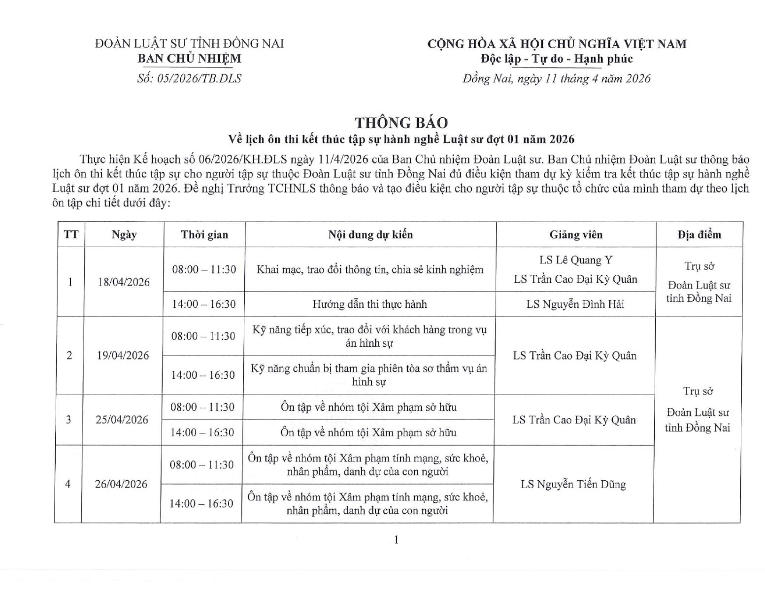 THÔNG BÁO VỀ LỊCH ÔN THI KẾT THÚC TẬP SỰ HÀNH NGHỀ LUẬT SƯ ĐỢT 01 NĂM 2026