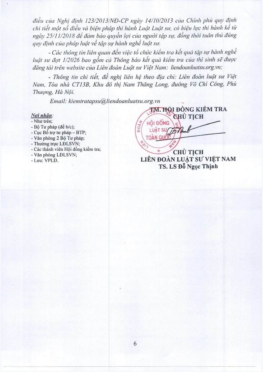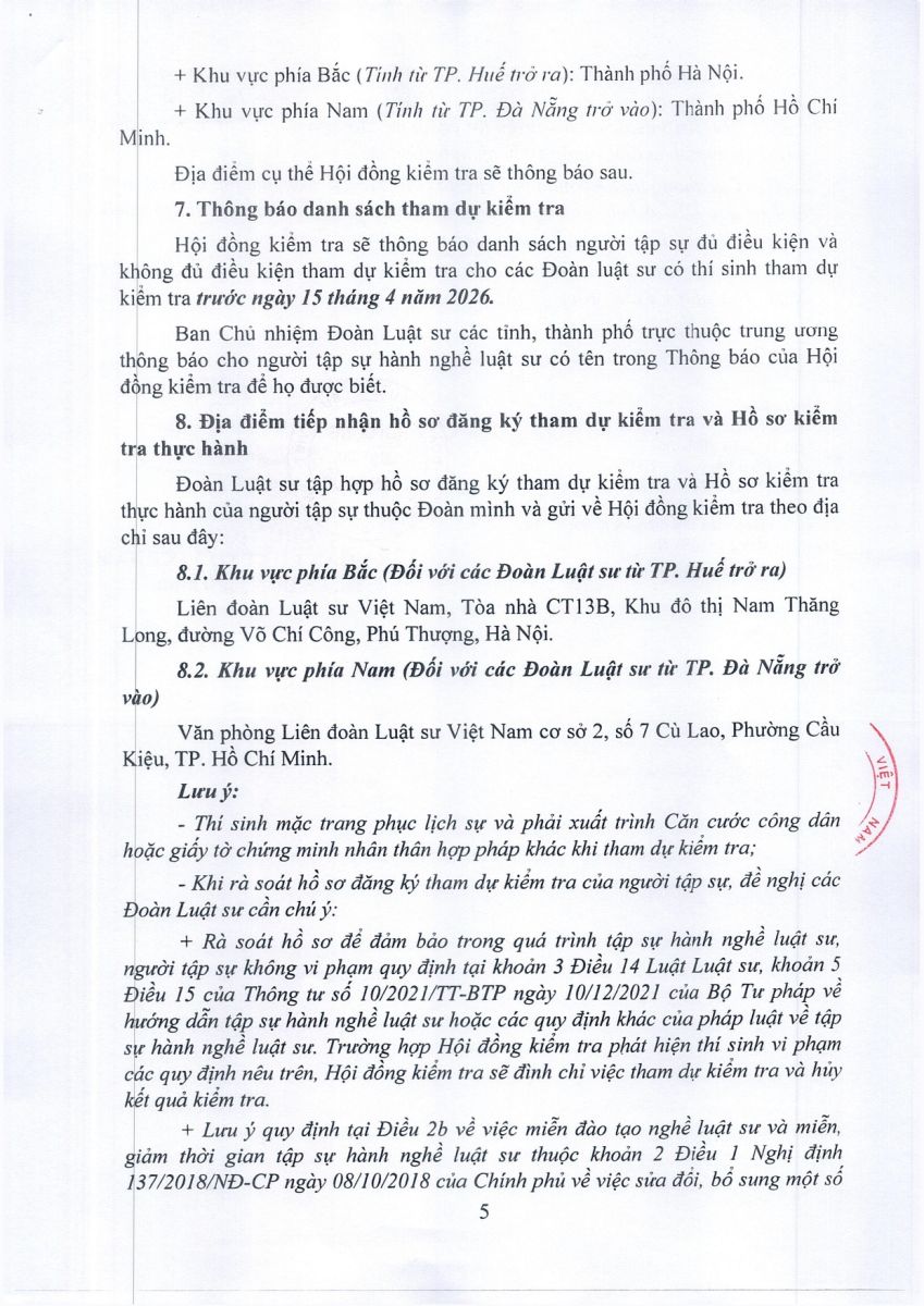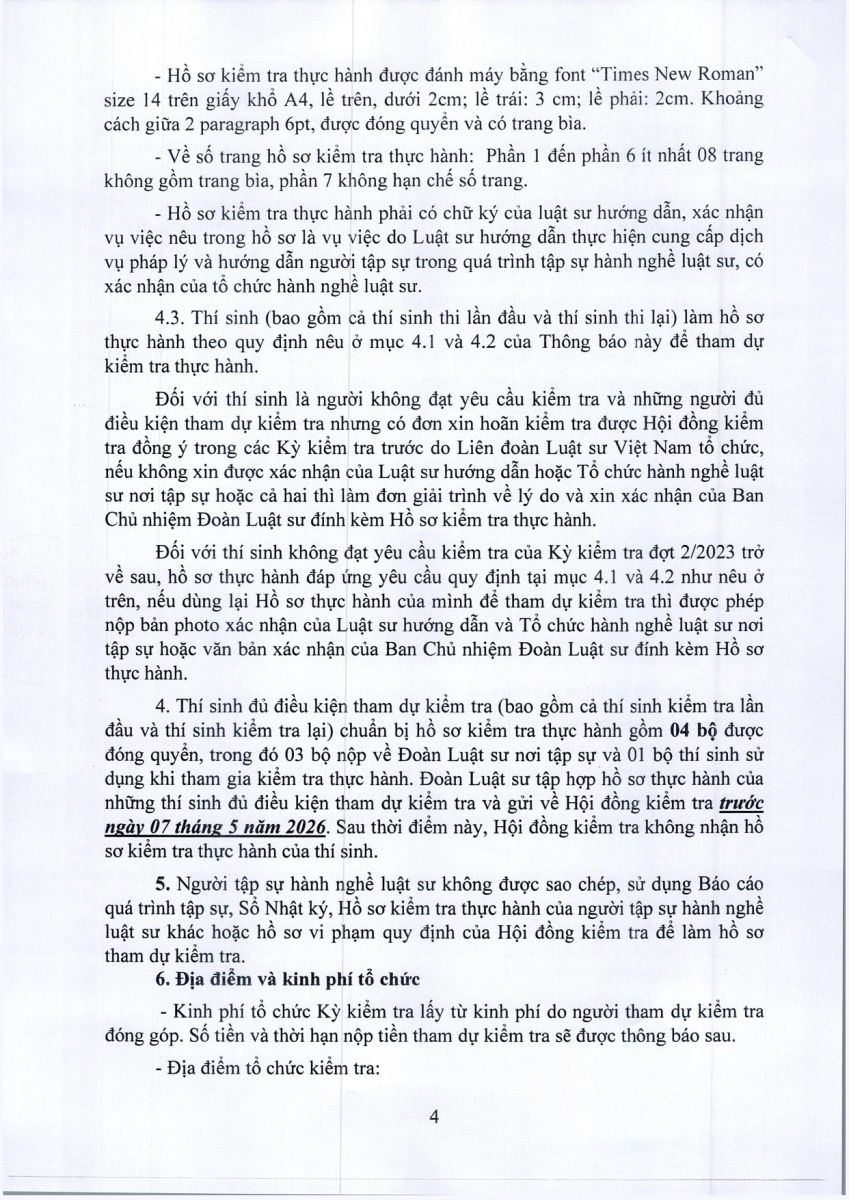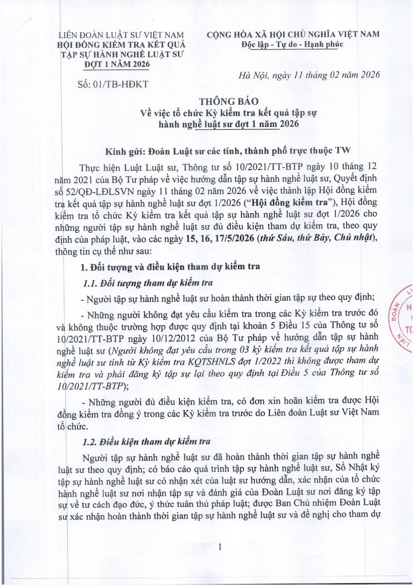 THÔNG BÁO VỀ VIỆC TỔ CHỨC KỲ KIỂM TRA KẾT QUẢ TẬP SỰ HÀNH NGHỀ LUẬT SƯ ĐỢT 1 NĂM 2026